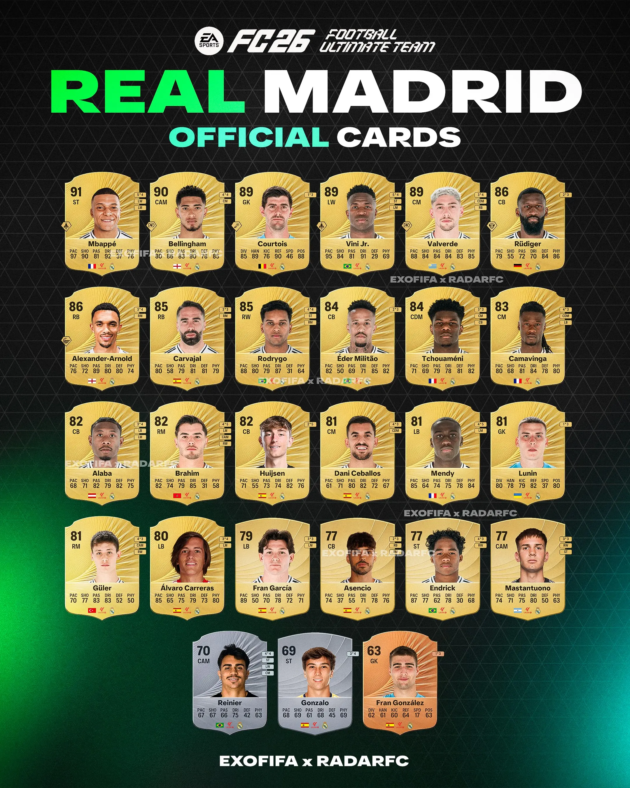 Die größte Überraschung ist das Debüt von Mbappé mit einer Bewertung von 91. Vinícius, Bellingham und Valverde haben sich in der Spitze etabliert, und die Startelf von Real sieht als eine der stärksten im Spiel aus.