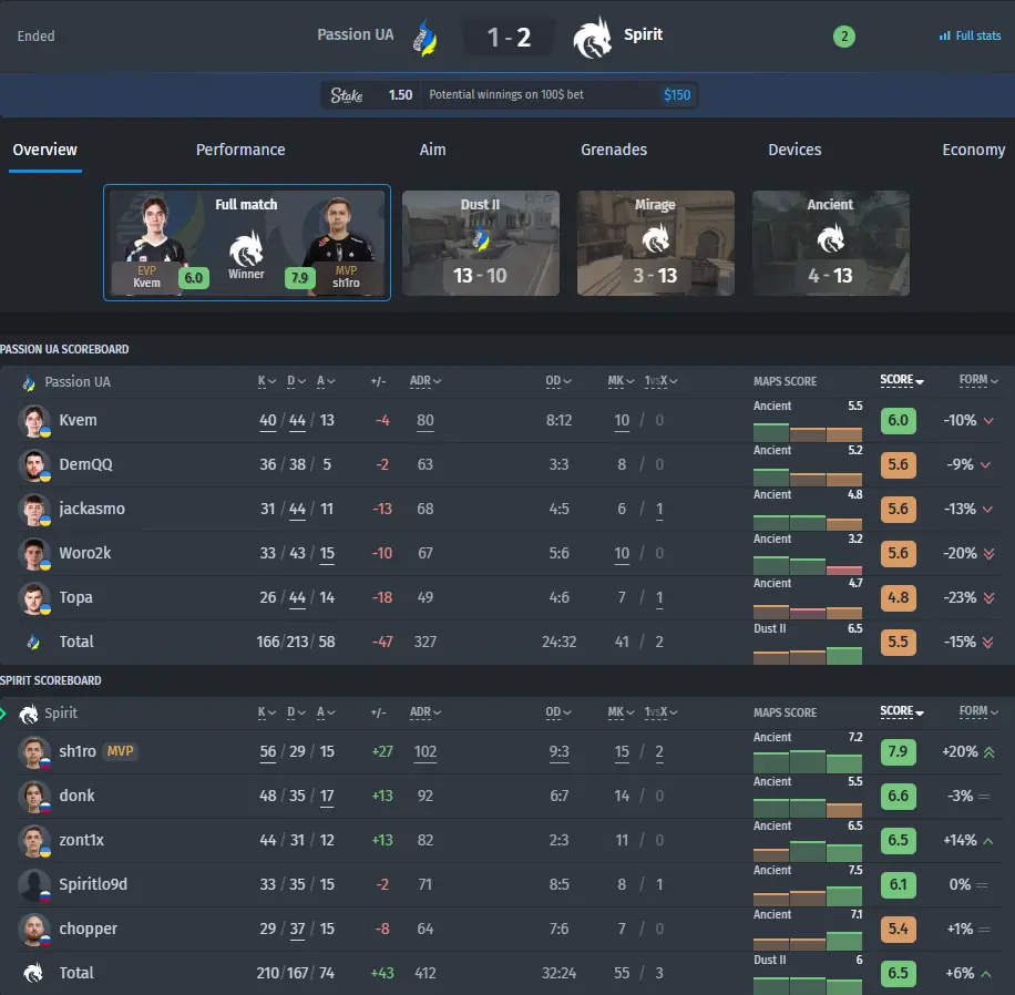 Die treibende Kraft von Spirit war Dmitry "sh1ro" Sokolov, der nicht nur mehrere entscheidende Clutches gewann, sondern die Serie auch mit einem K/D von 56–29, ADR 102 und 15 Multikills abschloss — er wurde zum MVP des Matches ernannt. Starke Unterstützung erhielt er von zont1x und donk, die auf ihren Maps dominierten.