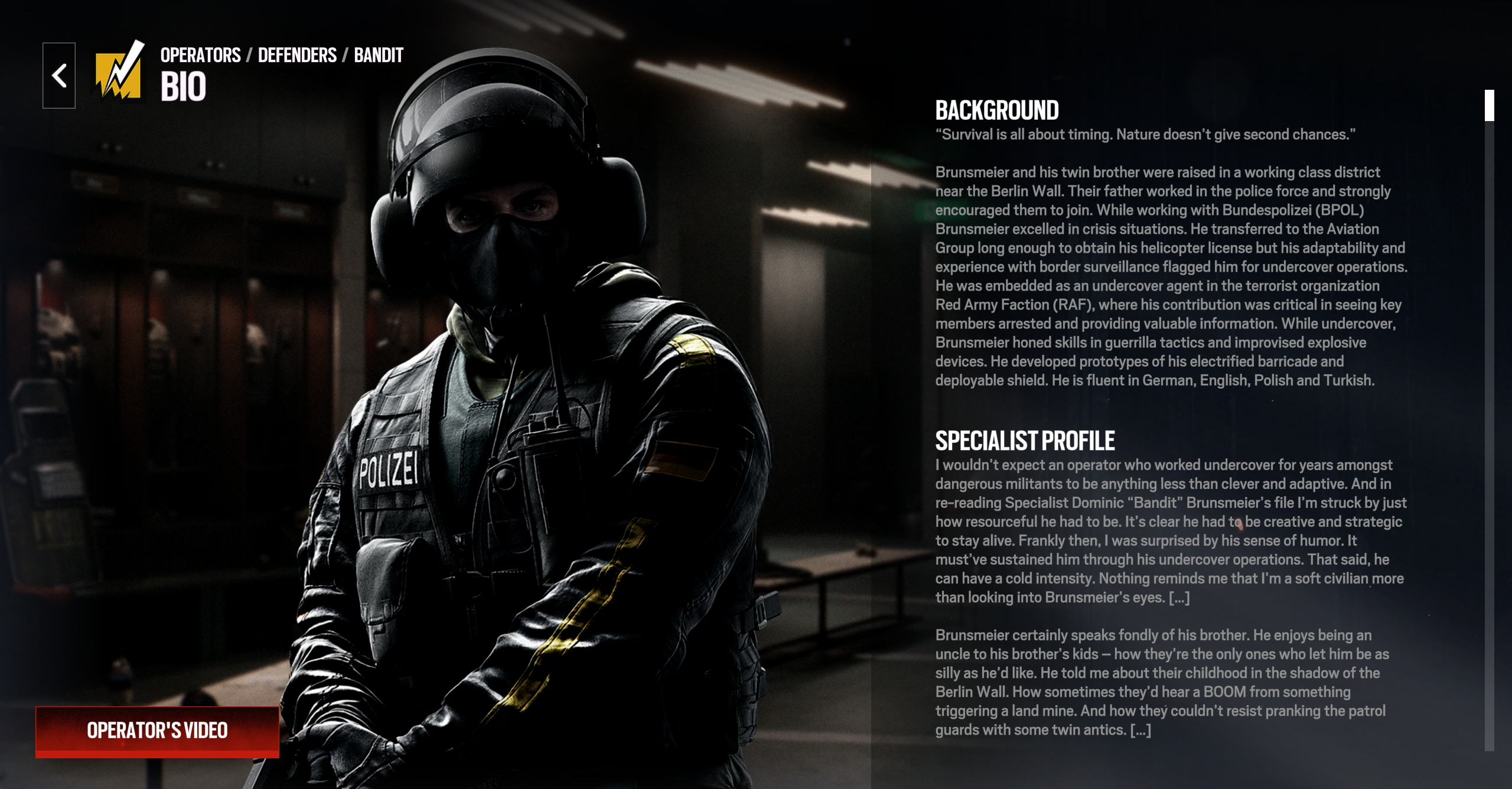 Bandit stammt direkt aus der deutschen Eliteeinheit GSG9 und ist einer der ursprünglichen Verteidiger von Rainbow Six Siege. Sein Name ist Dominic Brunsmeier, und er verbrachte vier Jahre undercover bei den Hells Angels in Hannover. Diese Zeit lehrte ihn so ziemlich alles - Guerillataktiken, Bombenbau, alles. Das Leben am Limit veränderte ihn, formte, wer er ist, und das sieht man an seiner Arbeitsweise, besonders mit seinem Trick: dem CED-1 Shock Wire. Dieses Gadget elektrisiert Verteidigungen und verändert das Spiel völlig. Bandits gesamte Spielweise dreht sich darum, clever und flexibel zu sein, den Angreifern immer einen Schritt voraus zu sein. Genau so spielt er auch im Spiel - listig, schnell und nie langweilig.