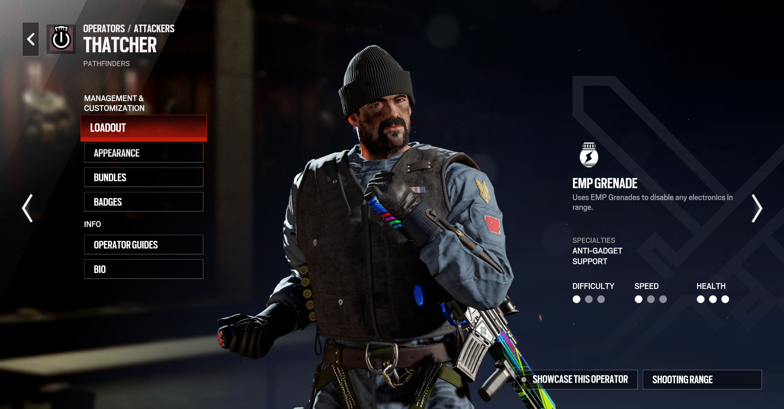 Thatcher begann bei der britischen Spezialeinheit Special Air Service, einer der ersten Operator in Siege. Er hat jahrelange Erfahrung in der elektronischen Kriegsführung und Terrorismusbekämpfung, und das merkt man. Sein Erscheinen in Operation Black Ice hat die Angriffsstrategien grundlegend umgestaltet, indem er eine verlässliche Gegenmaßnahme gegen die elektronischen Aufstellungen der Verteidiger bot.