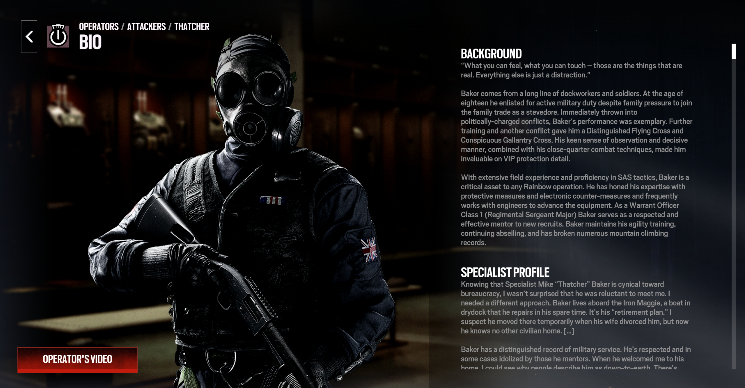 Thatcher ist seit dem ersten Tag ein wichtiger Angreifer in Rainbow Six Siege. Er ist der britische SAS-Mann mit den EMP-Granaten. Mike Baker, so sein richtiger Name, kennt sich bestens mit Sabotage aus. Dank ihm können Hard Breacher tatsächlich durch verstärkte Wände gelangen, ohne einen Stromschlag zu bekommen. Er hat die Spielweise der Angreifer grundlegend verändert.