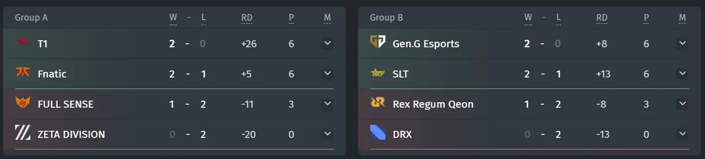 Con base en los resultados, Gen.G Esports y SLT avanzan a los playoffs, mientras que Rex Regum Qeon y DRX terminan su participación en el torneo, ubicándose en 7–8 y 5–6 respectivamente, y recibiendo $5,000 en premios por equipo.