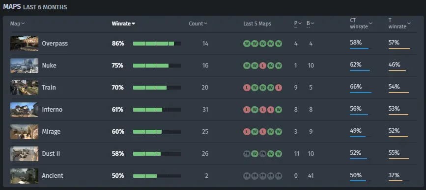 Overpassは彼らの最も得意な戦場で、そこでの防御と中盤のコールはほぼ完璧です。NukeとInfernoも非常に強く、たとえ「弱い」とされるマップでさえ、Dust2やTrainで50%以上の勝率を誇ります。