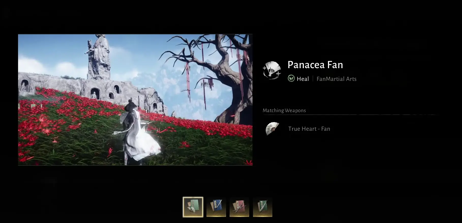 Chociaż Panacea Fan wygląda niepozornie, jest doskonałym narzędziem dla graczy wspierających. W trudniejszych starciach sprawia, że są one bardziej zarządzalne, a dodatkowo zmniejsza potrzebę leczenia i zasobów przetrwania podczas przygód. Panacea Fan można cieszyć się i odblokować wcześnie, lub zdobyć później przez mistrza z Qinghe. Jest to unikalny styl gry w Where Winds Meet.