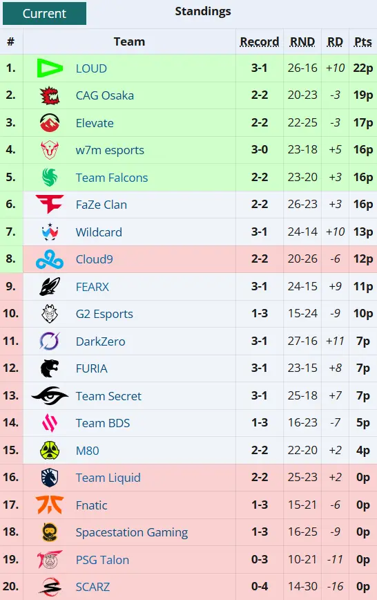 G2 Esports również łatwo pokonało Cloud9 wynikiem 7:3 na Nighthaven Labs. Najlepszym graczem drużyny był loira z 11 fragami, tylko 4 zgonami, KPR 1.1 i KOST 90%. Dzięki zwycięstwu Cloud9 znalazło się wśród 8 najlepszych drużyn, które awansują do fazy pucharowej, ale na ostatnim miejscu, i ma przed sobą jeszcze jeden mecz. Dlatego drużyna wciąż ma szansę stracić upragniony slot.