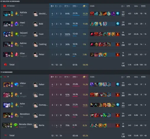 В первом матче дня T1 без особых трудностей обыграли KT Rolster со счетом 2:0. Коллектив показал четкую макроигру и индивидуальное превосходство на каждой позиции. Самым ценным игроком серии стал мидлейнер T1 Ли “Faker” Сан-хёк, который продемонстрировал стабильную игру с минимальным количеством ошибок и высокой вовлеченностью в командные действия, в среднем нанося 26,7k урона за карту. Полная статистика матча доступна по ссылке.