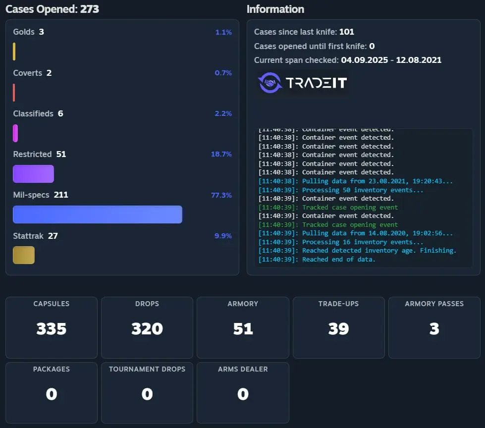 Ang mga website tulad ng LootSpectrum o CS2 Case Tracker ay nagpapahintulot sa iyo na i-upload ang iyong inventory data. Ipapakita nila kung ilang cases ang nabuksan mo, ang porsyento ng iyong bihirang item, at kung aling case ang madalas mong buksan. Ang ilang tool ay nagtatantiya pa ng kabuuang gastos at panalo mo sa cases.