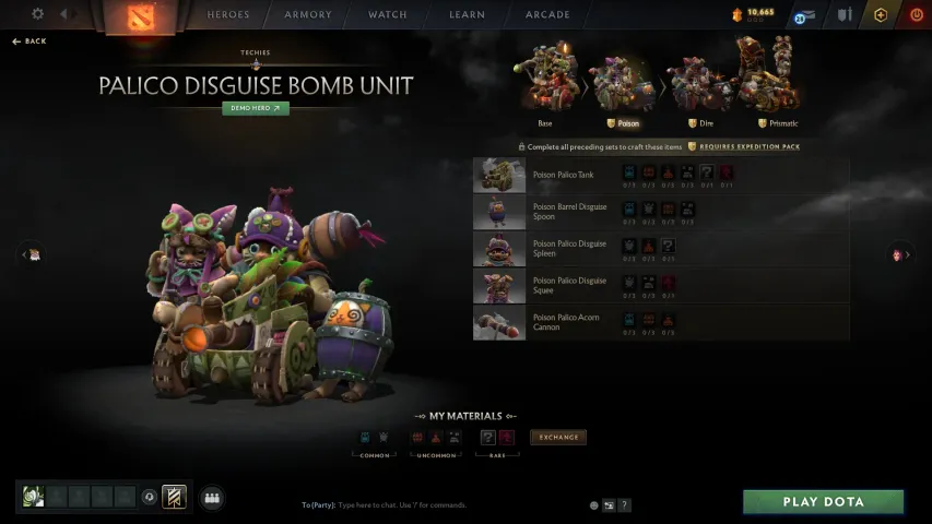 Makakakuha ang mga manlalaro ng libreng set para sa Sniper, Techies, Anti-Mage, Dragon Knight, Beastmaster, at Windranger, pati na rin ang kurier na Palico. Maaaring i-unlock ang karagdagang mga estilo para sa mga item na ito sa pagbili ng Expedition Pack sa halagang $15. Tanging sa set na ito makukuha ang eksklusibong alagang Poogie.