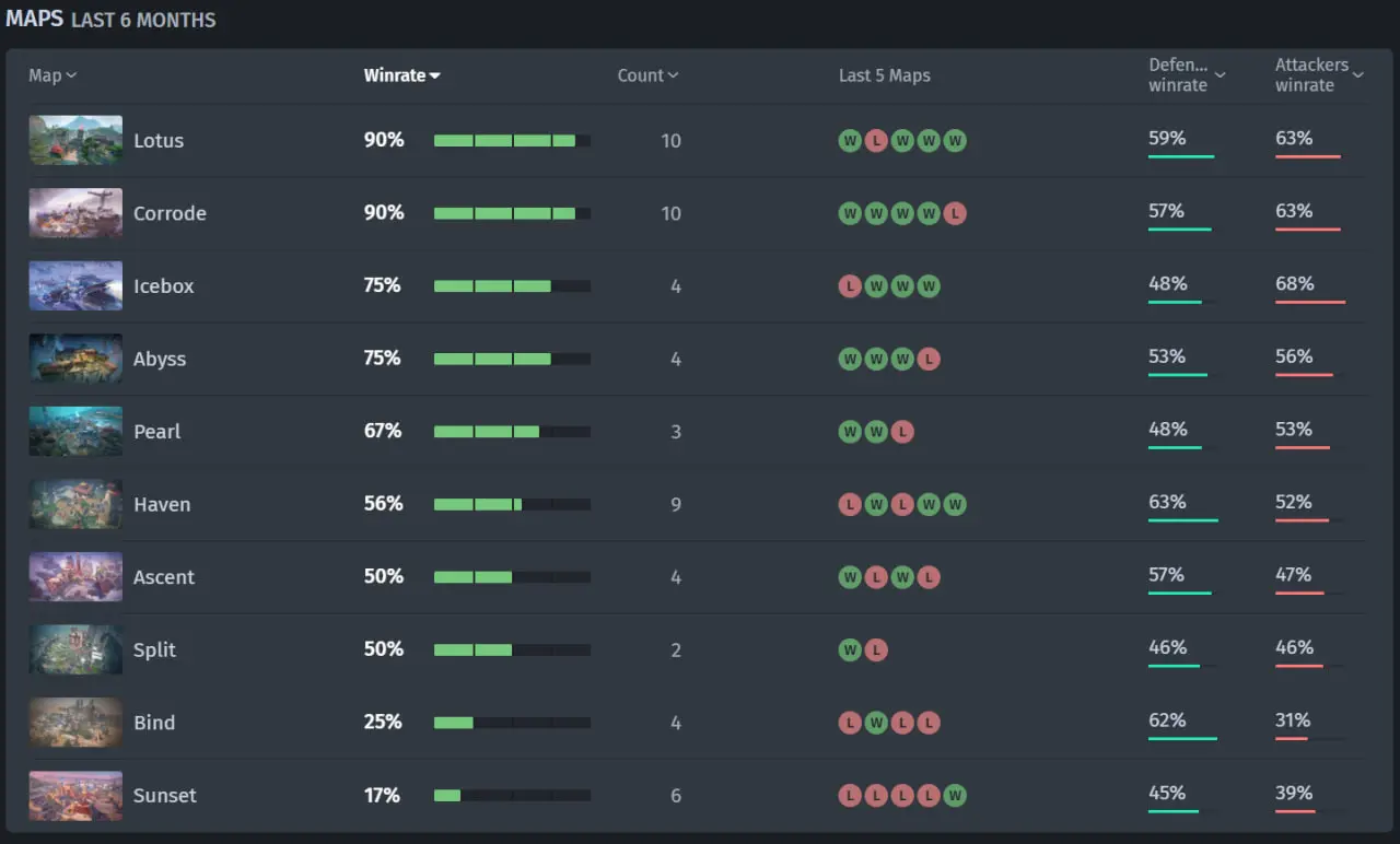 Ang mga istatistika ng mapa ay isang mahalagang kasangkapan na nagpapakita kung ano ang ginagawa ng isang team na mas mahusay o mas mahina kaysa sa iba. Halimbawa, ang clutch win rate o post-plant success ay nagbubunyag ng mga tendensya sa istilo ng paglalaro, habang ang mga porsyento ng maagang pagpatay ay nagpapahiwatig kung gaano ka-agresibo ang isang team sa pagpasok sa mga round.