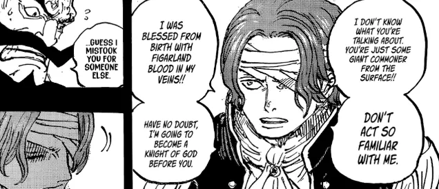 - Aralarındaki ayrılığın önceden belirtilmesi: 1168. Bölüm, bu geri dönüşten sonra Shanks ve Kutsal Topraklar arasında oluşan çatlağı ince bir şekilde kurabilir. Shamrock'un Hükümetin doktrinlerini sürdürürken Shanks'in bunları sorgulaması, Shanks'in ilahi bir uygulayıcı rolünden özgür ruhlu bir korsana dönüşmeye başlamasını vurgulayabilir ya da sadece çift taraflı bir ajan olduğunu gösterebilir.