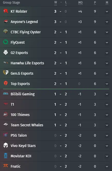 G2 đã chiến thắng Bilibili Gaming với tỷ số 15:9. Hans sama gây ra 23K sát thương và hoàn thành trận đấu với KDA 4/2/6, SkewMond đã tỏa sáng trong các pha giao tranh với KDA 4/1/8, và BrokenBlade đã chơi tự tin ở đường trên. Thống kê chi tiết của trận đấu có sẵn tại đây.